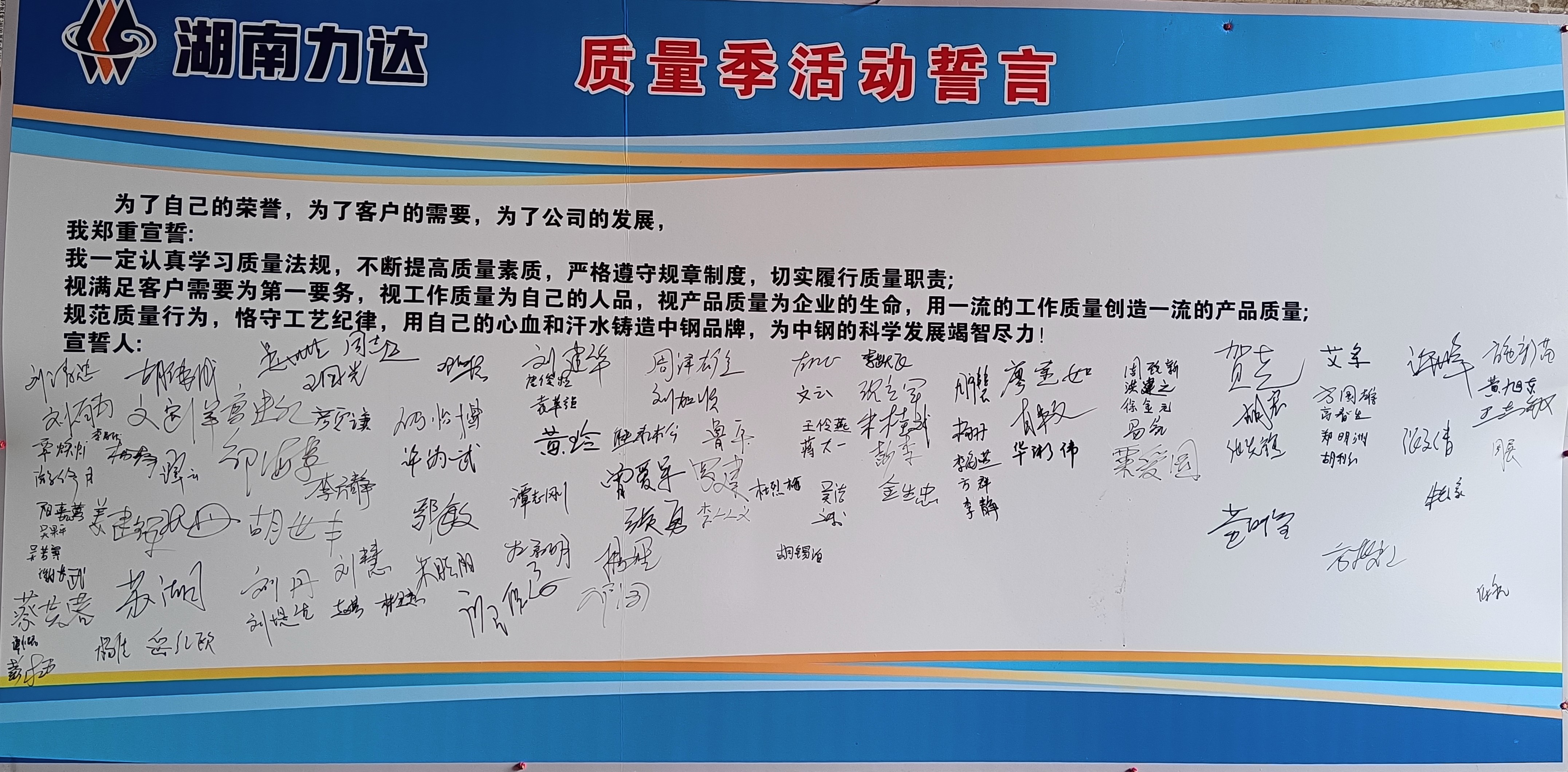 最后,全体人员在公司副总经理晏吐生的带领下进行宣誓:为了自己的荣誉,为了客户的需要,为了公司的发展,我郑重宣誓:我一定认真学习质量法规,不断提高质量素质,严格遵守规章制度,切实履行质量职责;视满足客户需要为第一要务,视工作质量为自己的人品,视产品质量为企业的生命,用一流的工作质量创造一流的产品质量;规范质量行为,恪守工艺纪律,用自己的心血和汗水铸造中钢品牌,为中钢的科学发展竭智尽力!